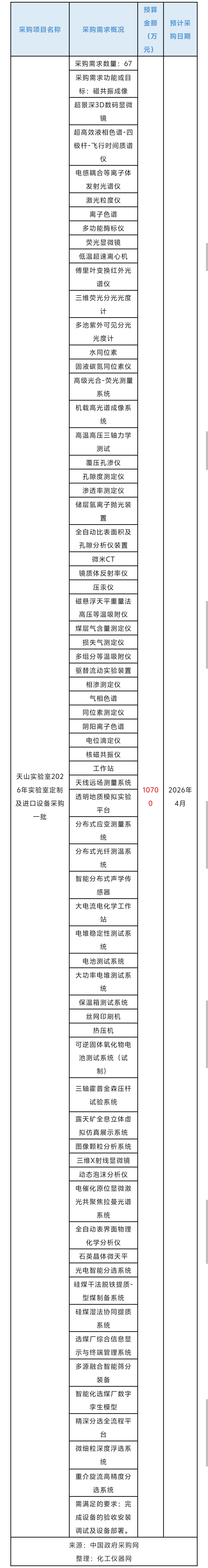 近日,天山實驗室發布一批實驗室設備采購意向,計劃采購超高效液相色譜-四極桿-飛行時間質譜儀、電感耦合等離子體發射光譜儀、激光粒度儀、離子色譜、多功能酶標儀等設備,預算總金額1.07億元。預計采購時間20264月。