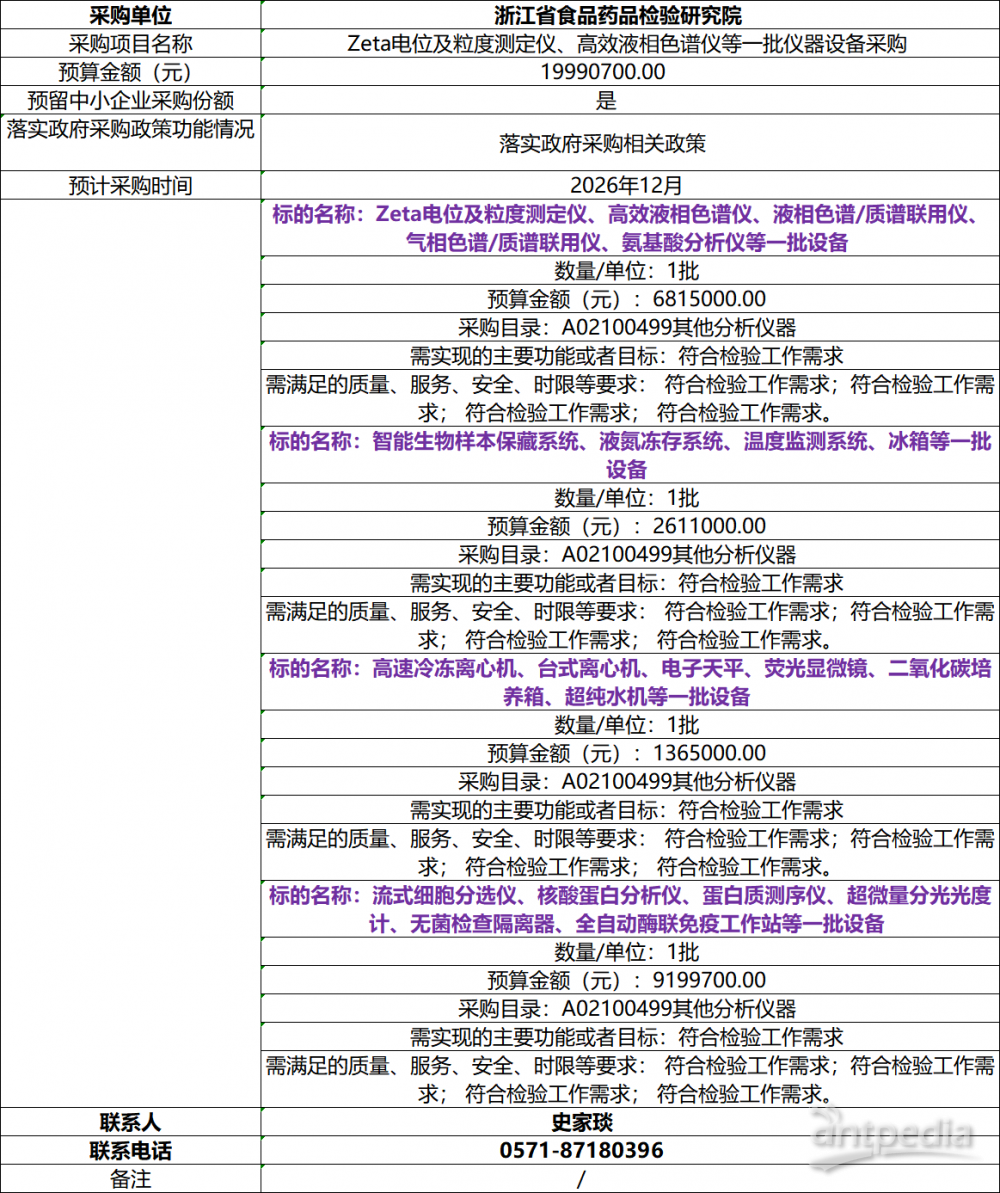 4月21日,浙江省食品藥品檢驗研究院發(fā)布 2026年8月-12月政府采購意向,預計12月份將采購包括 Zeta 電位及粒度測定儀、高效液相色譜儀、液相色譜 / 質譜聯(lián)用儀、氣相色譜 / 質譜聯(lián)用儀、氨基酸分析儀、高速冷凍離心機、臺式離心機、電子天平、熒光顯微鏡、二氧化碳培養(yǎng)箱、超純水機等共計 4 批儀器設備,采購預算總金額為 1999.07 萬元。詳情如下:為便于供應商及時了解政府采購信息,根據(jù)《財政部關于開展政府采購意向公開工作的通知》(財庫〔2020〕10 號)等有關規(guī)定,現(xiàn)將浙江省食品藥品檢驗研究院 2026年8月至12月采購意向公開如下: