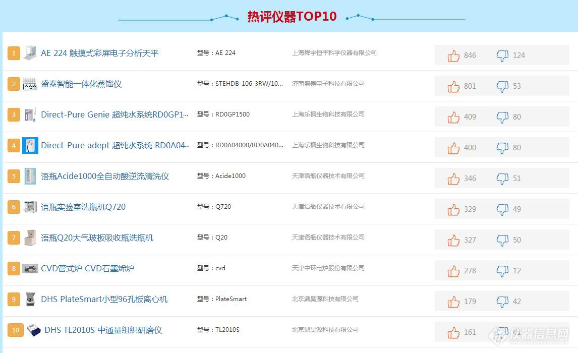 隨著申報(bào)儀器數(shù)量的不斷增加,相關(guān)儀器的“入圍評審”正式啟動。通過初審的68臺儀器開始接受用戶的入圍評議。在活動專題網(wǎng)站上,用戶通過采取投票和評論的形式,對儀器展開入圍評審。截止日前,剔除惡意刷票后,收到用戶有效投票7686張,評論591條。