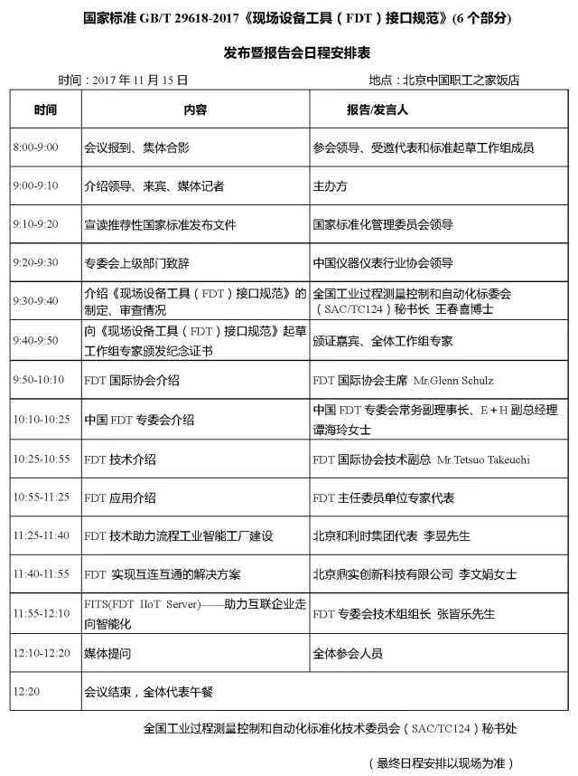 本次發(fā)布會將邀請國家標準化管理委員會領(lǐng)導宣讀推薦性國家標準發(fā)布文件并由中國儀器儀表行業(yè)協(xié)會領(lǐng)導致辭,FDT國際協(xié)會主席 Glenn Schulz先生和中國FDT專委會常務(wù)副理事長、E+H副總經(jīng)理譚海玲女士將分別對FDT國際組織的發(fā)展情況以及中國FDT的發(fā)展情況進行介紹,FDT國際組織技術(shù)副總 Tetsuo Takeuchi先生將圍繞FDT技術(shù)的最新進展進行闡述,北京和利時集團和北京鼎實創(chuàng)新科技有限公司作為企業(yè)代表將重點探討FDT技術(shù)在國內(nèi)的研發(fā)和具體應(yīng)用。此外,SAC/TC124秘書長王春喜博士將代表標準起草工作組介紹FDT接口規(guī)范(6個部分)的國家標準的制定、審查過程和工作情況。屆時,將有接近百名業(yè)內(nèi)專家與行業(yè)用戶代表齊聚一堂,彼此交流多年的項目心得和實戰(zhàn)經(jīng)驗,探討智能制造最前沿的熱點話題,提出各自的見解和最新的想法,共同探尋智能制造和FDT設(shè)備集成技術(shù)的應(yīng)用及未來發(fā)展趨勢。