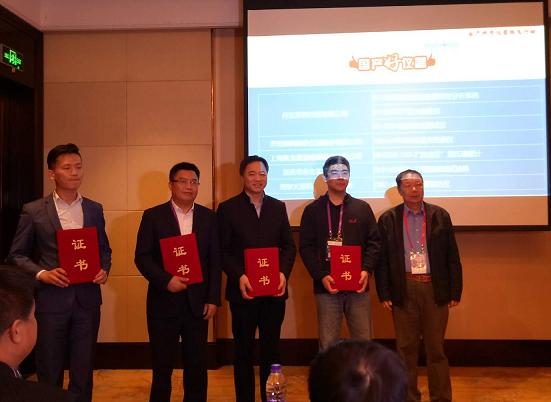頒獎留念(左至右:重慶永生銷售經理沈榮華,奧龍星迪總經理費宏,丹東百特總經理董青云,濟南微納總經理任飛,中國儀器儀表行業協會高級顧問閆增序)