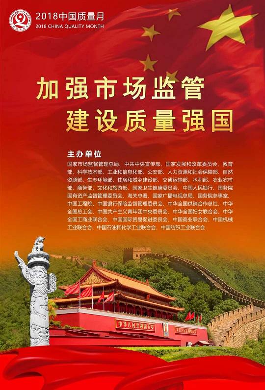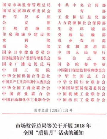 2018年9月,市場(chǎng)監(jiān)管總局聯(lián)合中共中央宣傳部、教育部、工業(yè)和信息化部、銀保監(jiān)會(huì)、全國(guó)總工會(huì)、共青團(tuán)中央、機(jī)械工業(yè)聯(lián)合會(huì)等共34個(gè)部門(mén),以“加強(qiáng)市場(chǎng)監(jiān)管 建設(shè)質(zhì)量強(qiáng)國(guó)”為主題,共同部署開(kāi)展2018年全國(guó)“質(zhì)量月”活動(dòng)。