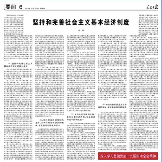 11月22日,國務院副總理劉鶴在《人民日報》撰文,標題為《堅持和完善社會主義基本經濟制度》。