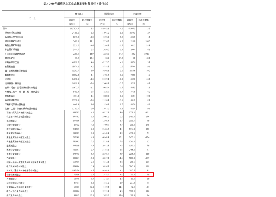 其中表三顯示,2019年儀器儀表制造業(yè)實現(xiàn)利潤總額700.4億元,同比增長5.9%。