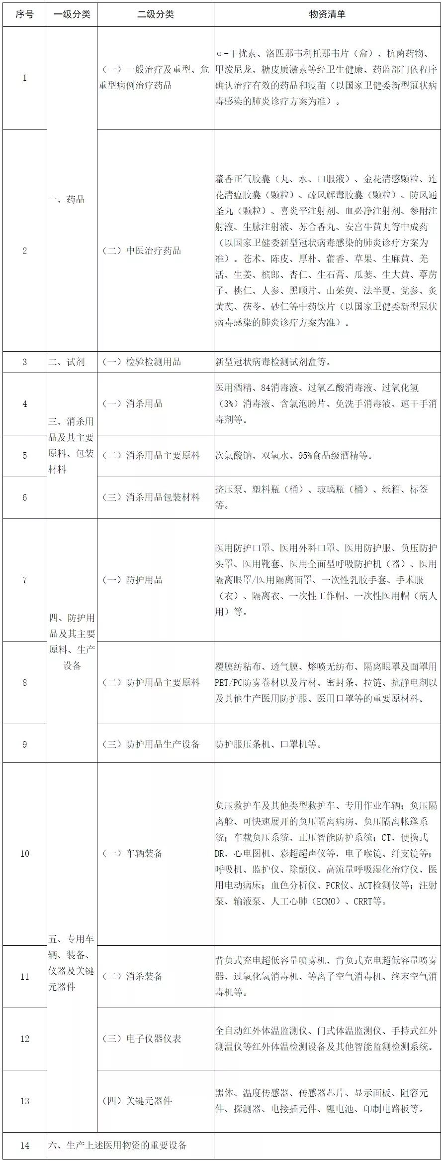疫情防控重點保障物資(醫(yī)療應急)清單