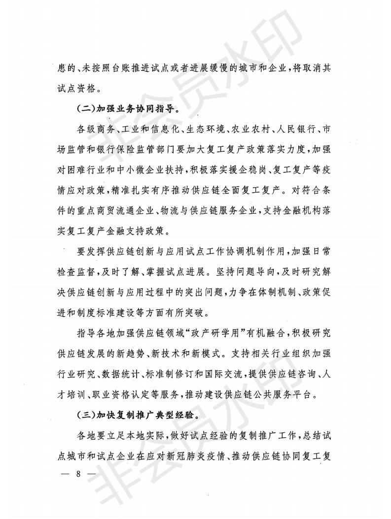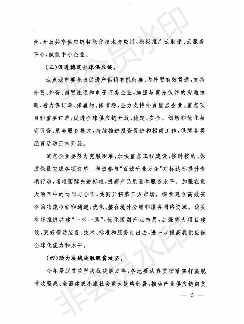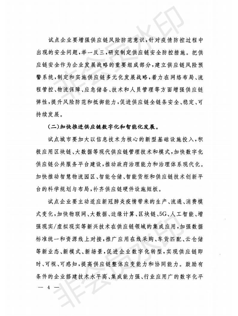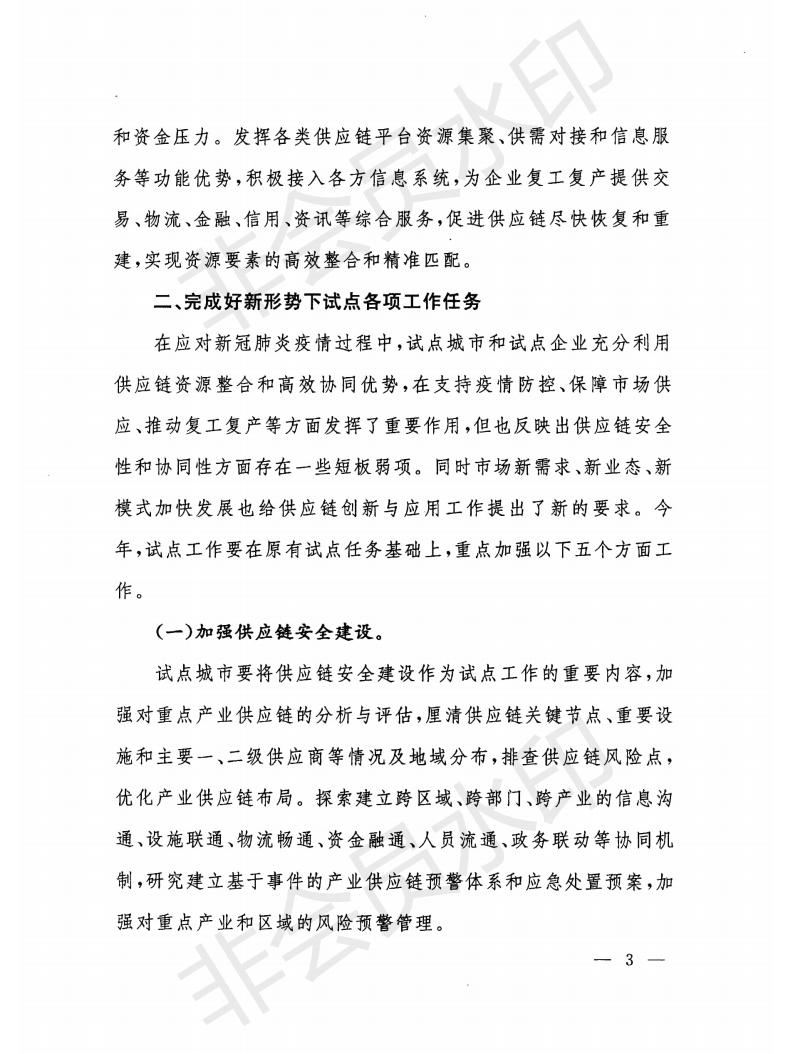 通知指出,為認(rèn)真貫徹落實(shí)打贏脫貧攻堅(jiān)戰(zhàn)、全面建成小康社會(huì)重大戰(zhàn)略部署和堅(jiān)持在常態(tài)化疫情防控中加快推進(jìn)生產(chǎn)生活秩序全面恢復(fù)相關(guān)要求,針對(duì)供應(yīng)鏈安全性和協(xié)同性方面存在的短板弱項(xiàng),積極應(yīng)對(duì)市場(chǎng)新需求、新業(yè)態(tài)、新模式加快發(fā)展給供應(yīng)鏈創(chuàng)新與應(yīng)用工作提出的新要求,要在原有試點(diǎn)任務(wù)基礎(chǔ)上,重點(diǎn)做好加強(qiáng)供應(yīng)鏈安全建設(shè)、加快推進(jìn)供應(yīng)鏈數(shù)字化和智能化發(fā)展、促進(jìn)穩(wěn)定全球供應(yīng)鏈、助力決戰(zhàn)決勝脫貧攻堅(jiān)和充分利用供應(yīng)鏈金融服務(wù)實(shí)體企業(yè)等五個(gè)方面工作。