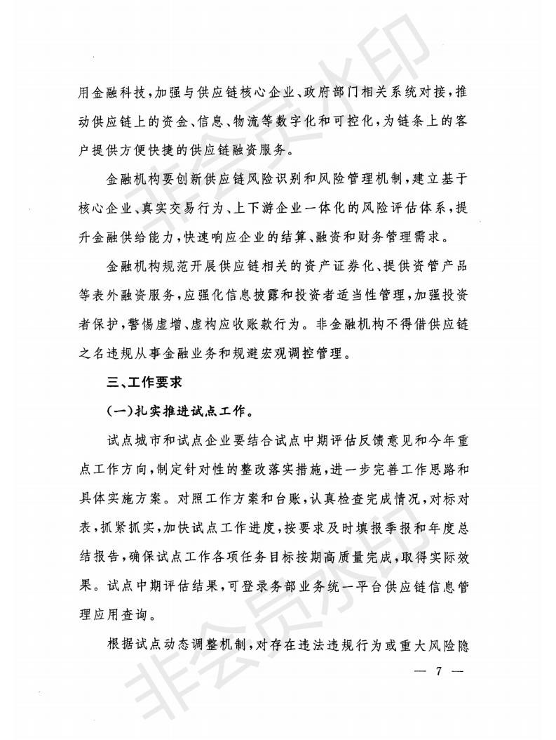 通知強(qiáng)調(diào),試點(diǎn)城市和試點(diǎn)企業(yè)要扎實(shí)推進(jìn)試點(diǎn)工作,結(jié)合試點(diǎn)中期評(píng)估反饋意見(jiàn)和今年重點(diǎn)工作方向,制定針對(duì)性的整改落實(shí)措施,進(jìn)一步完善工作思路和具體實(shí)施方案,加快試點(diǎn)工作進(jìn)度,確保試點(diǎn)工作各項(xiàng)任務(wù)目標(biāo)按期高質(zhì)量完成;各部門(mén)要加強(qiáng)業(yè)務(wù)協(xié)同指導(dǎo),精準(zhǔn)扎實(shí)有序推動(dòng)供應(yīng)鏈全面復(fù)工復(fù)產(chǎn),加強(qiáng)日常檢查監(jiān)督,指導(dǎo)各地加強(qiáng)供應(yīng)鏈領(lǐng)域“政產(chǎn)研學(xué)用”有機(jī)融合;各地要立足本地實(shí)際,加快復(fù)制推廣典型經(jīng)驗(yàn)。