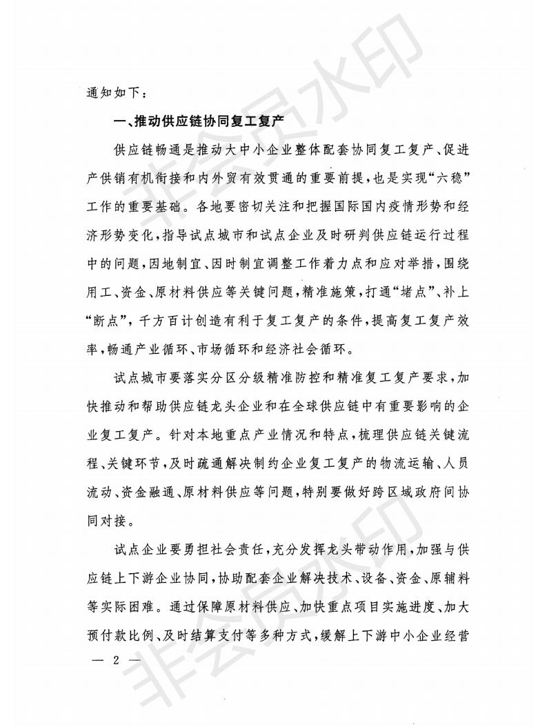 通知要求,試點(diǎn)城市要落實(shí)分區(qū)分級(jí)精準(zhǔn)防控和精準(zhǔn)復(fù)工復(fù)產(chǎn)要求,加快推動(dòng)和幫助供應(yīng)鏈龍頭企業(yè)和在全球供應(yīng)鏈中有重要影響的企業(yè)復(fù)工復(fù)產(chǎn);試點(diǎn)企業(yè)要勇?lián)鐣?huì)責(zé)任,充分發(fā)揮龍頭帶動(dòng)作用,加強(qiáng)與供應(yīng)鏈上下游企業(yè)協(xié)同,協(xié)助配套企業(yè)解決技術(shù)、設(shè)備、資金、原輔料等實(shí)際困難。