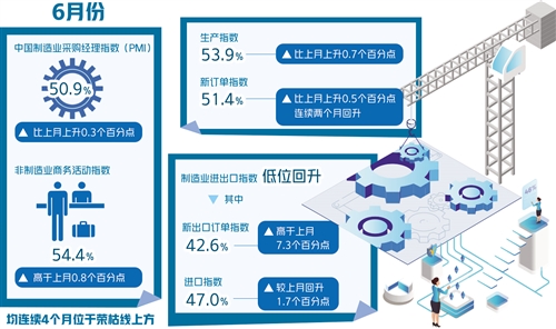 國家統計局服務業調查中心高級統計師趙慶河表示,6月份制造業生產指數和新訂單指數分別為53.9%和51.4%,比上月上升0.7個和0.5個百分點,其中新訂單指數連續兩個月回升,表明供需兩端持續回暖。