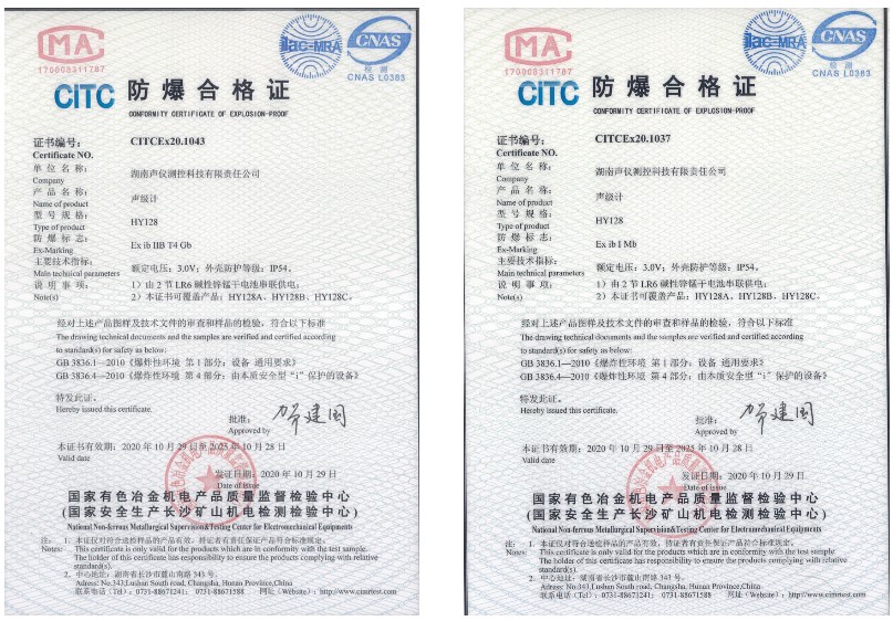 2020年10月28日,湖南聲儀測控所研發(fā)的HY128系列多功能聲級計(jì),含HY128、HY128A、HY128B、HY128C四種型號產(chǎn)品,順利通過國家有色冶金機(jī)電產(chǎn)品質(zhì)量監(jiān)督檢測中心防爆認(rèn)證,同時(shí)獲得本安防爆、礦用本安防爆合格證。這意味著該系列產(chǎn)品能進(jìn)一步適應(yīng)不同場所和不同環(huán)境下的廣泛應(yīng)用,并且有更多型號和不同功能供客戶根據(jù)需要提供貼切選擇。