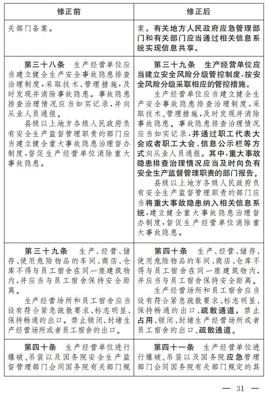 十一、將第三十八條改為第三十九條,修改為:“生產經營單位應當建立安全風險分級管控制度,按安全風險分級采取相應的管控措施。