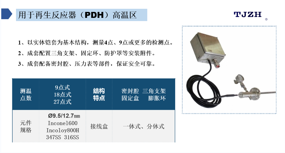 天津市中環(huán)溫度儀表有限公司發(fā)布的新產(chǎn)品是再生反應(yīng)器(PDH)高可靠性柔性多點熱電偶。
