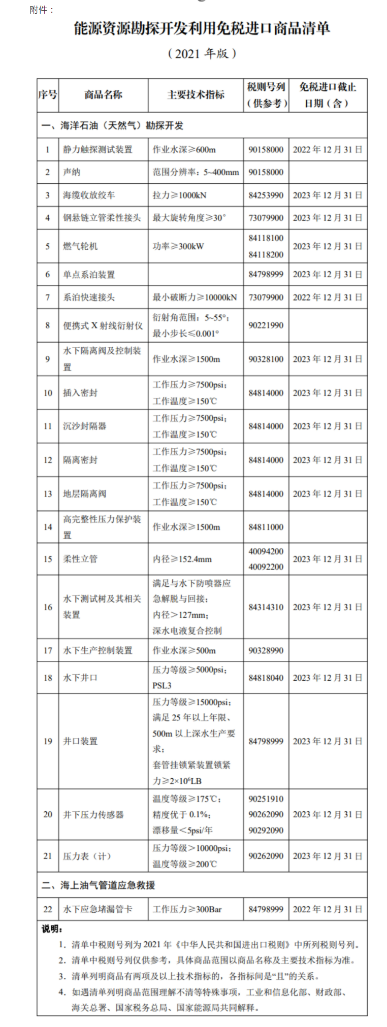 根據(jù)《財(cái)政部 海關(guān)總署 稅務(wù)總局關(guān)于“十四五”期間能源資源勘探開(kāi)發(fā)利用進(jìn)口稅收政策的通知》(財(cái)關(guān)稅〔2021〕17號(hào))和《財(cái)政部 國(guó)家發(fā)展改革委 工業(yè)和信息化部 海關(guān)總署 稅務(wù)總局 國(guó)家能源局關(guān)于“十四五”期間能源資源勘探開(kāi)發(fā)利用進(jìn)口稅收政策管理辦法的通知》(財(cái)關(guān)稅〔2021〕18號(hào))有關(guān)要求,結(jié)合國(guó)內(nèi)外形勢(shì)變化,工業(yè)和信息化部、財(cái)政部、海關(guān)總署、國(guó)家稅務(wù)總局、國(guó)家能源局制定了《能源資源勘探開(kāi)發(fā)利用免稅進(jìn)口商品清單(2021年版)》,現(xiàn)予發(fā)布,自2021年1月1日起實(shí)施。