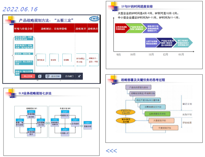 第一步雙差分析,老師介紹了差距的分析過程方法,并提醒要留意分析不全、根因分析不透和急于求成的問題。第二步,戰略使命目標,老師強調了其重要性,并從創造價值角度舉例說明了企業總體戰略、業務單元戰略和職能戰略的使命、目標都應該是什么。第三步,市場洞察工具方法及關注點,老師梳理了市場洞察的邏輯關系、“五看三定”的邏輯關系,并分享了宏觀環境分析方法、制造業常見的關鍵成功因素和競品分析的工具方法。第四步,業務創新設計,老師強調戰略控制點一定要能有效保證戰略實現,即,要有差異、有一定門檻、一定時間內很難復制和超越,給自己留有紅利期,此外還要明確產品的價值定位、盈利模式及增長途徑。第五步,業務計劃及產品路標規劃,老師分享了如何定目標(財務目標和市場目標)、如何定戰略控制點、如何定策略(包括營銷策略、研發策略、供應策略、采購策略、服務策略等產品的各個環節)的方法。對于第六步年度規劃,老師從戰略部署及關鍵任務的思考過程模型進行分析,并介紹了如何對關鍵任務進行優先級排序。最后一步,老師介紹了BLM對戰略執行的支撐。