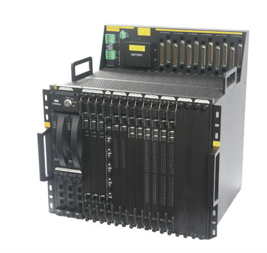 總線接口模塊對(duì)外包含3個(gè)光纖接口,供應(yīng)商或系統(tǒng)集成商可以根據(jù)實(shí)際項(xiàng)目的需要選擇采用星型拓?fù)浣Y(jié)構(gòu)擴(kuò)展遠(yuǎn)程機(jī)架還是采用總線拓?fù)洹S捎陧?xiàng)目的差異性,遠(yuǎn)程機(jī)架與主機(jī)架的相對(duì)分布各不相同,靈活的拓?fù)淇梢詭椭脩舯M量節(jié)省布線費(fèi)用。