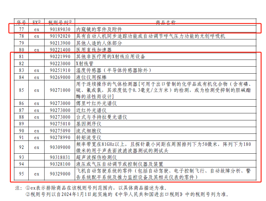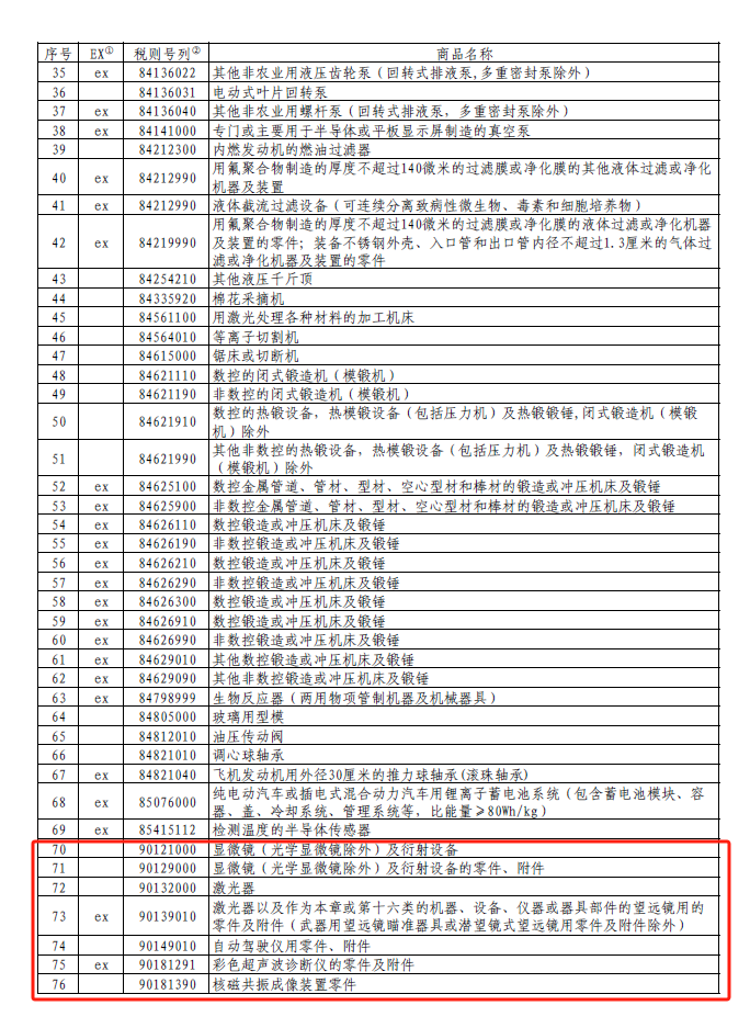 本次公布清單含顯微鏡(光學(xué)顯微鏡除外)及衍射設(shè)備;顯微鏡(光學(xué)顯微鏡除外)及衍射設(shè)備的零件、附件;激光器;激光器以及作為本章或第十六類(lèi)的機(jī)器、設(shè)備、儀器或器具部件的望遠(yuǎn)鏡用的零件及附件(武器用望遠(yuǎn)鏡瞄準(zhǔn)器具或潛望鏡式望遠(yuǎn)鏡用零件及附件除外);自動(dòng)駕駛儀用零件、附件;彩色超聲波診斷儀的零件及附件;核磁共振成像裝置零件;內(nèi)窺鏡的零件及附件;其他非醫(yī)療用的X射線應(yīng)用設(shè)備;X射線管;溫度傳感器(半導(dǎo)體傳感器除外);液位儀用探棒;用于連續(xù)操作的氣體檢測(cè)器[可用于出口管制的化學(xué)品或有機(jī)化合物(含有磷、硫、氟或氯,其濃度低于0.3毫克/立方米)的檢測(cè),或?yàn)闄z測(cè)受抑制的膽堿酯酶的活性而設(shè)計(jì)];傅里葉紅外光譜儀;近紅外光譜儀;臺(tái)式與手持拉曼光譜儀;基因測(cè)序儀;流式細(xì)胞儀;轉(zhuǎn)矩流變儀;超聲波探傷檢測(cè)儀;液壓或氣壓自動(dòng)調(diào)節(jié)或控制儀器及裝置;飛機(jī)自動(dòng)駕駛系統(tǒng)的零件等儀器及零部件。