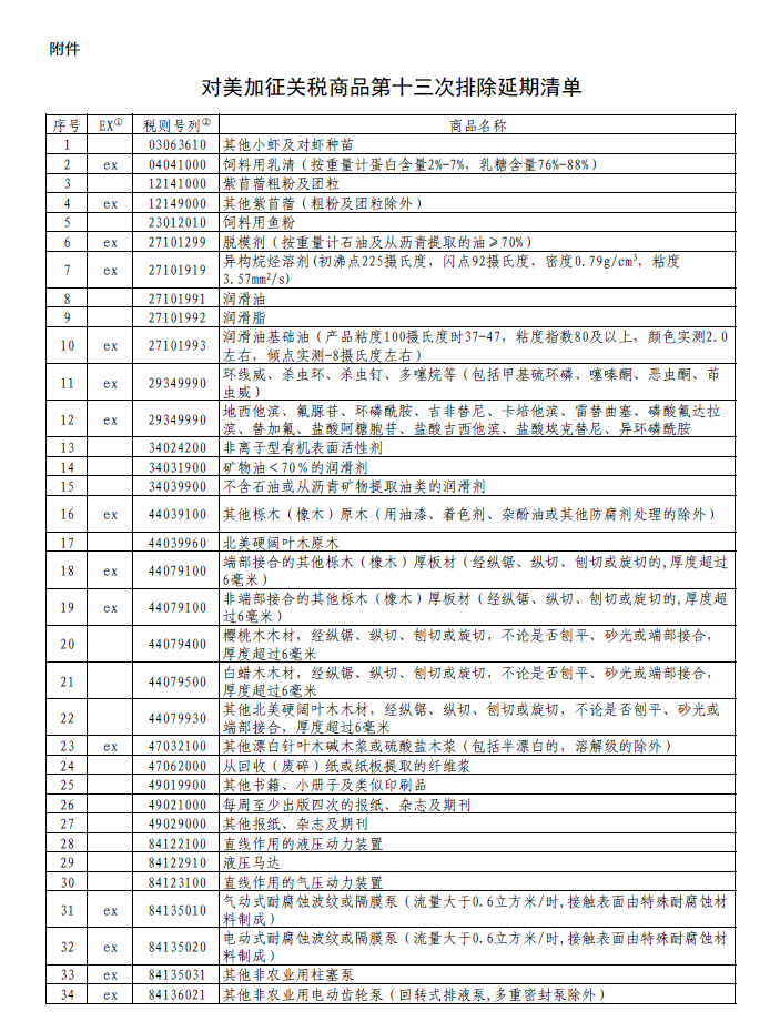 經(jīng)國(guó)務(wù)院批準(zhǔn),國(guó)務(wù)院關(guān)稅稅則委員會(huì)公布對(duì)美加征關(guān)稅商品第十三次排除延期清單,對(duì)《國(guó)務(wù)院關(guān)稅稅則委員會(huì)關(guān)于對(duì)美加征關(guān)稅商品第十一次排除延期清單的公告》(稅委會(huì)公告2023年第6號(hào))中的相關(guān)商品,延長(zhǎng)排除期限,自2024年1月1日至2024年7月31日,繼續(xù)不加征我為反制美301措施所加征的關(guān)稅。