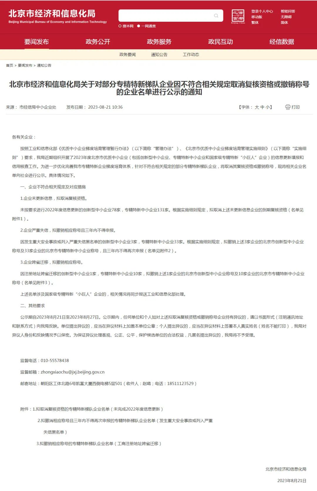 8月21日,北京市經(jīng)信局官網(wǎng)公布消息顯示,為進(jìn)一步優(yōu)化完善北京市專精特新企業(yè)梯度培育體系,針對不符合相關(guān)規(guī)定的部分專精特新梯隊(duì)企業(yè),將取消其復(fù)核資格或撤銷稱號(hào),并將相關(guān)企業(yè)名單向社會(huì)進(jìn)行公示。公示名單共涉及北京174家專精特新中小企業(yè)和82家創(chuàng)新型中小企業(yè)!