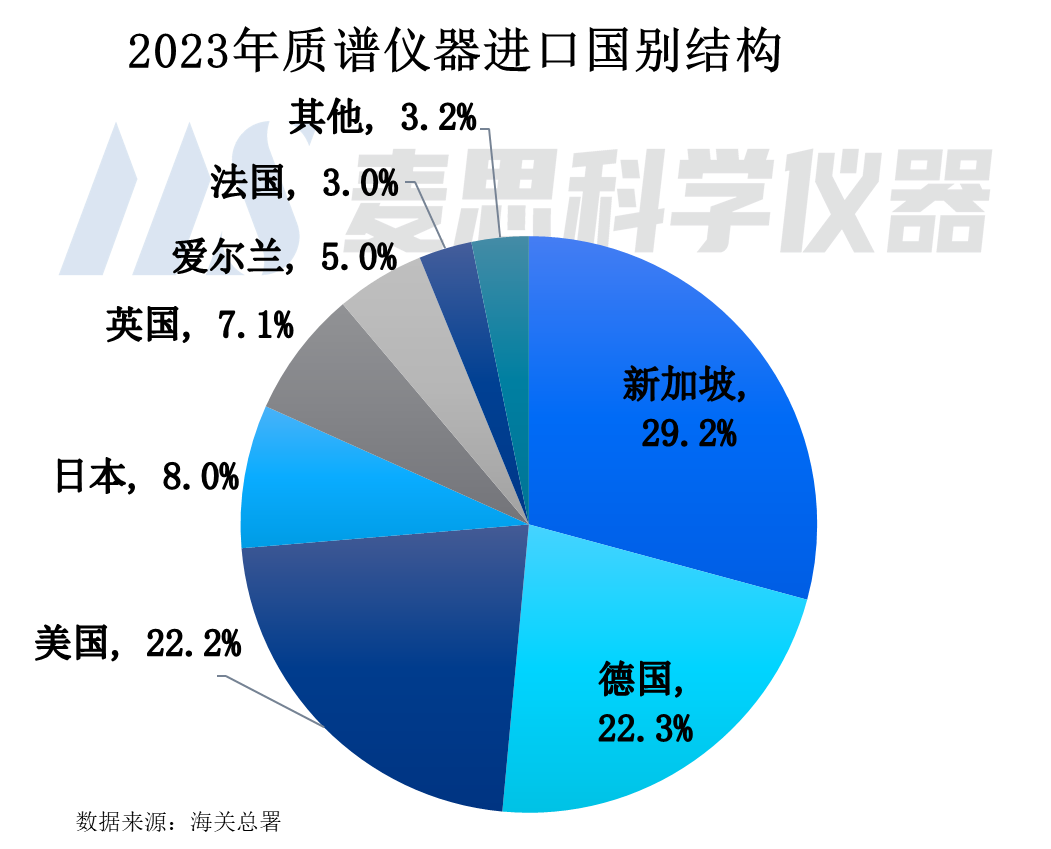 2023年質譜儀器進口國別結構看,排名前五位為新加坡、德國、美國、日本以及英國,進口金額占比分別為29.2%22.3%22.2%8.0%以及7.1%