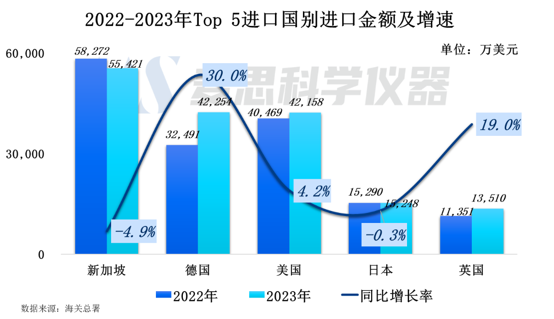 對比Top5國別2022年及2023年進口金額,從德國、美國、英國進口的質譜儀器金額呈現正增長,其中德國最為明顯,同比增速達30.0%。而新加坡和日本的進口金額則有輕微下降趨勢,同比下滑4.9%0.3%
