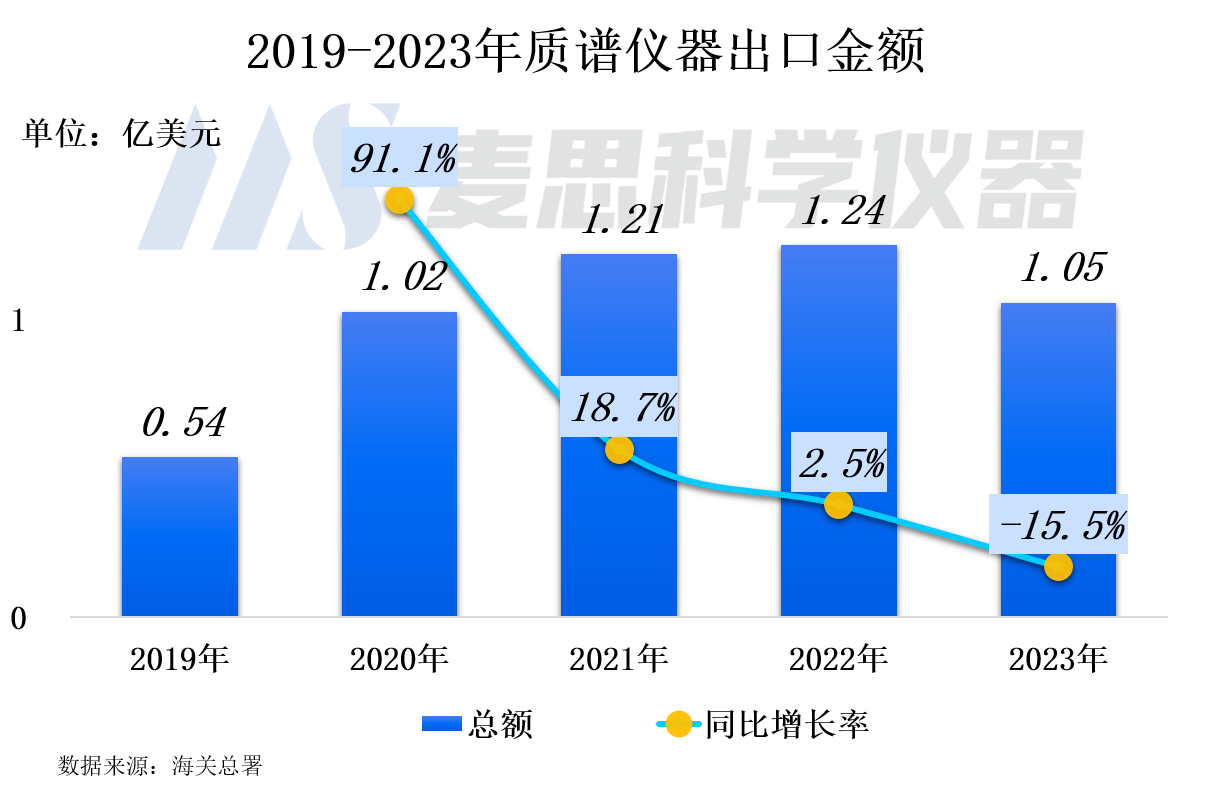 2023年我國質譜儀器出口金額達1.05億美元(約合人民幣7.35億元),同比下降15.5%