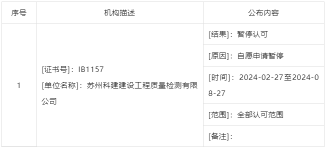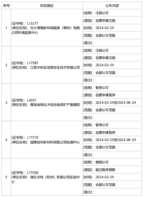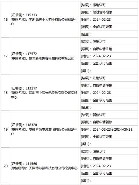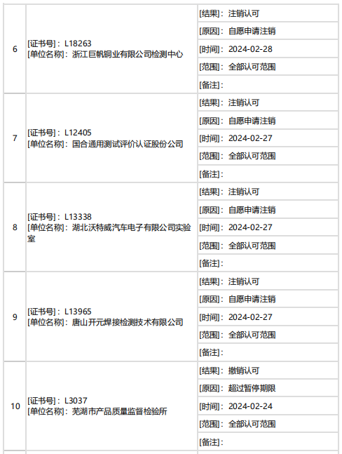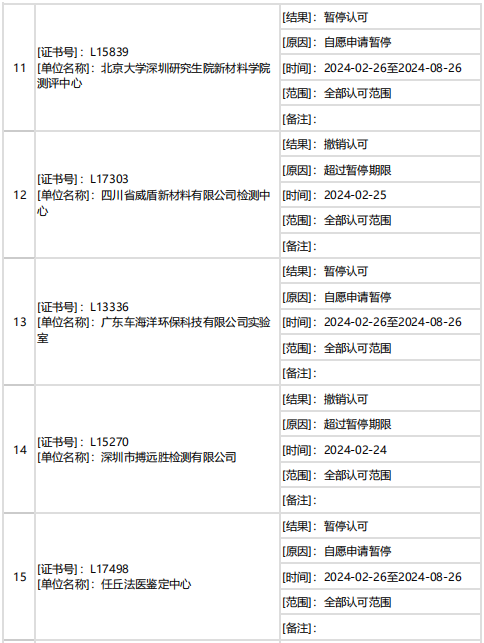 據(jù)中國(guó)合格評(píng)定國(guó)家認(rèn)可委員會(huì)(CNAS)消息,2月下半月共計(jì)27家機(jī)構(gòu)暫停/撤銷/注銷認(rèn)可資質(zhì)。7家機(jī)構(gòu)因超過暫停期限被撤銷認(rèn)可,其他機(jī)構(gòu)為自愿申請(qǐng)暫停/注銷認(rèn)可。
