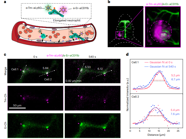 其中,團(tuán)隊(duì)利用開(kāi)發(fā)的新型近紅外二區(qū)稀土熒光探針特異性的標(biāo)記了小鼠的中性粒細(xì)胞以研究炎癥血管中活化中性粒細(xì)胞的體內(nèi)成像(圖2)。中性粒細(xì)胞能夠在血管內(nèi)壁爬行到外滲部位,然后外滲是中性粒細(xì)胞活化的典型特征。CD11b是一種介導(dǎo)細(xì)胞粘附和遷移的中性粒細(xì)胞表面蛋白,在活化的中性粒細(xì)胞表面表達(dá)上調(diào)。中性粒細(xì)胞上Ly6GCD11b蛋白的雙重標(biāo)記有助于在體內(nèi)特異性地跟蹤活化的中性粒細(xì)胞。因此,在缺血性腦卒中小鼠模型中,靜脈注射抗ly6g抗體偶聯(lián)的α-TmNPs和抗cd11b抗體偶聯(lián)的α-ErNPs (α-Er-aCD11b),標(biāo)記活化的中性粒細(xì)胞,雙標(biāo)記的中性粒細(xì)胞表現(xiàn)出微弱的運(yùn)動(dòng)、滾動(dòng)和爬行,表明它們?cè)趦?nèi)皮細(xì)胞表面粘附牢固。此外,可以觀察到雙標(biāo)記的中性粒細(xì)胞,沿著血流的剪切力被拉長(zhǎng),這通常被認(rèn)為是中性粒細(xì)胞通過(guò)炎癥血管外滲的最后一步。