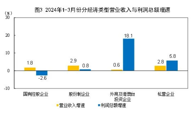 1-3月份,規(guī)模以上工業(yè)企業(yè)中,國有控股企業(yè)實(shí)現(xiàn)利潤總額5738.2億元,同比下降2.6%;股份制企業(yè)實(shí)現(xiàn)利潤總額11203.0億元,增長0.8%;外商及港澳臺(tái)投資企業(yè)實(shí)現(xiàn)利潤總額3737.5億元,增長18.1%;私營企業(yè)實(shí)現(xiàn)利潤總額3679.7億元,增長5.8%。