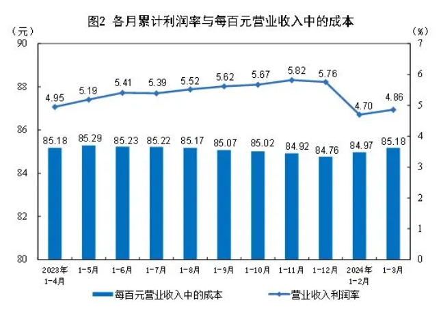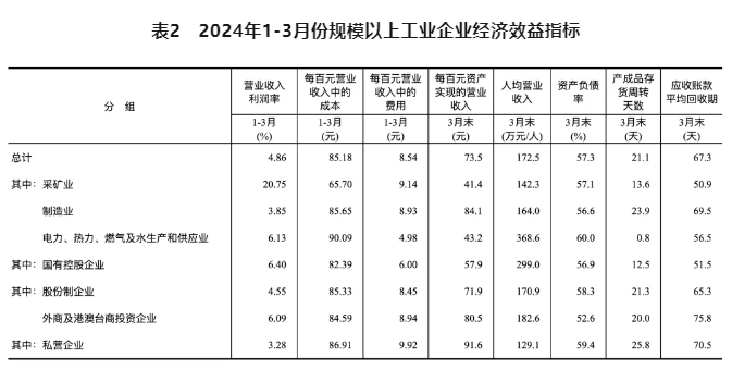 1-3月份,規(guī)模以上工業(yè)企業(yè)實(shí)現(xiàn)營業(yè)收入30.96萬億元,同比增長2.3%;發(fā)生營業(yè)成本26.38萬億元,增長2.5%;營業(yè)收入利潤率為4.86%,同比提高0.09個(gè)百分點(diǎn)。