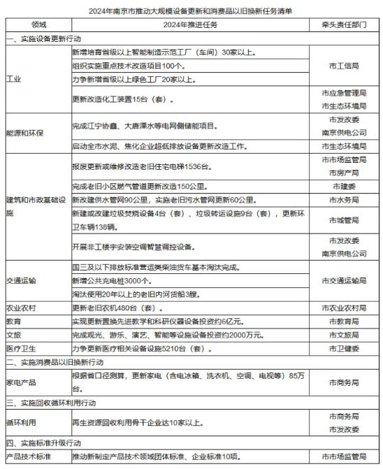 2024年南京市推動大規(guī)模設備更新和消費品以舊換新任務清單。
