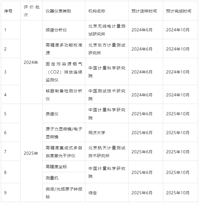 (四)評價試驗(20246—202510月)。此次計量測試評價根據儀器儀表類別分兩個年度批次進行(具體見附件3)。確定參加此次計量測試評價的儀器儀表生產企業,按批次要求時間向市場監管總局指定的計量測試評價機構提交滿足要求的樣機。計量測試評價機構制定計量測試評價規范和工作方案,對產品開展計量測試評價,并出具計量測試評價報告。