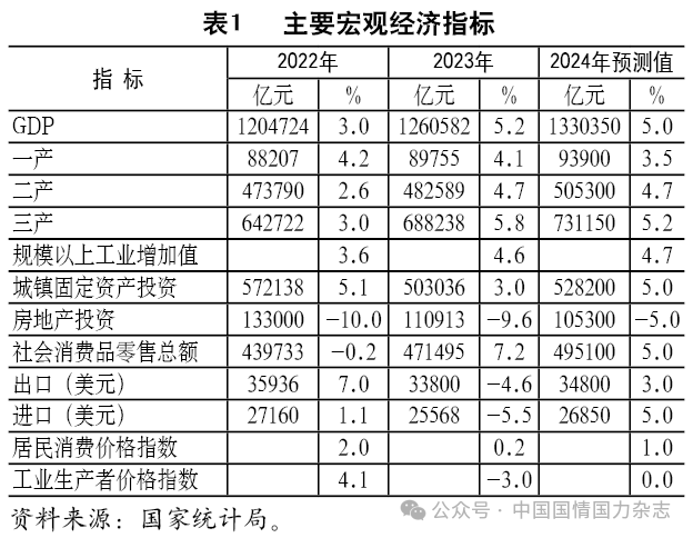 2023年是三年新冠肺炎疫情防控轉段后經濟恢復發展的一年,經濟同比增速呈現出前低、中高、后穩的特征,全年經濟增長5.2%,就業達到1244萬人,物價低位運行;新興產業增長較快,產業結構繼續轉型升級;科技創新實現新的突破,涌現出一批科技創新成果;金融、科技等機構改革取得進展;糧食、能源供給充足,地方債風險得到化解,安全發展基礎鞏固夯實;居民收入增長快于經濟增長,農村居民人均可支配收入高于城鎮居民,民生保障有力有效。但我國經濟發展過程中仍面臨一些突出矛盾和問題,需引起高度關注。
