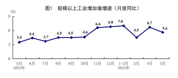5月份,全國規模以上工業增加值同比增長5.6%,環比增長0.30%。分三大門類看,采礦業增加值同比增長3.6%,制造業增長6.0%,電力、熱力、燃氣及水生產和供應業增長4.3%。裝備制造業增加值增長7.5%,高技術制造業增加值增長10.0%,增速分別快于全部規模以上工業1.9和4.4個百分點。分經濟類型看,國有控股企業增加值增長3.6%;股份制企業增長6.4%,外商及港澳臺投資企業增長2.5%;私營企業增長5.9%。分產品看,3D打印設備、新能源汽車、集成電路產品產量同比分別增長36.3%、33.6%、17.3%。1-5月份,全國規模以上工業增加值同比增長6.2%。5月份,制造業采購經理指數為49.5%,企業生產經營活動預期指數為54.3%。1-4月份,全國規模以上工業企業實現利潤總額20947億元,同比增長4.3%。