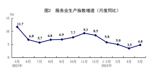 5月份,全國服務業生產指數同比增長4.8%,比上月加快1.3個百分點。分行業看,信息傳輸、軟件和信息技術服務業,租賃和商務服務業,交通運輸、倉儲和郵政業,批發和零售業生產指數同比分別增長12.9%、8.8%、5.6%、5.0%,分別比上月加快2.1、2.7、1.3和1.5個百分點。1-5月份,全國服務業生產指數同比增長5.0%。1-4月份,規模以上服務業企業營業收入同比增長8.2%。5月份,服務業商務活動指數為50.5%;服務業業務活動預期指數為57.0%。其中,郵政、電信廣播電視及衛星傳輸服務、互聯網軟件及信息技術服務、文化體育娛樂等行業商務活動指數位于55.0%以上較高景氣區間。