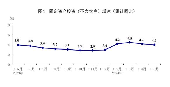 1-5月份,全國固定資產投資(不含農戶)188006億元,同比增長4.0%;扣除房地產開發投資,全國固定資產投資增長8.6%。分領域看,基礎設施投資同比增長5.7%,制造業投資增長9.6%,房地產開發投資下降10.1%。全國新建商品房銷售面積36642萬平方米,同比下降20.3%;新建商品房銷售額35665億元,下降27.9%。分產業看,第一產業投資同比增長3.0%,第二產業投資增長12.5%,第三產業投資同比持平。民間投資增長0.1%;扣除房地產開發投資,民間投資增長6.9%。高技術產業投資同比增長11.5%,其中高技術制造業和高技術服務業投資分別增長10.4%、14.3%。高技術制造業中,航空、航天器及設備制造業,電子及通信設備制造業投資分別增長53.1%、10.4%;高技術服務業中,電子商務服務業、信息服務業投資分別增長32.5%、19.1%。5月份,固定資產投資(不含農戶)環比下降0.04%。