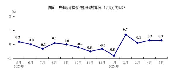 5月份,全國居民消費價格(CPI)同比上漲0.3%,漲幅與上月持平;環比下降0.1%。分類別看,食品煙酒價格同比下降1.0%,衣著價格上漲1.6%,居住價格上漲0.2%,生活用品及服務價格上漲0.8%,交通通信價格下降0.2%,教育文化娛樂價格上漲1.7%,醫療保健價格上漲1.5%,其他用品及服務價格上漲3.6%。在食品煙酒價格中,鮮果價格下降6.7%,糧食價格上漲0.5%,鮮菜價格上漲2.3%,豬肉價格上漲4.6%??鄢称泛湍茉磧r格后的核心CPI同比上漲0.6%。1-5月份,全國居民消費價格同比上漲0.1%。
