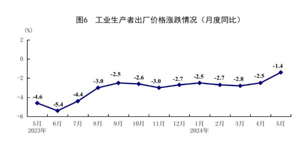 5月份,全國工業生產者出廠價格同比下降1.4%,降幅比上月收窄1.1個百分點;環比上漲0.2%。全國工業生產者購進價格同比下降1.7%,環比上漲0.3%。1-5月份,全國工業生產者出廠價格和購進價格同比分別下降2.4%和3.0%。