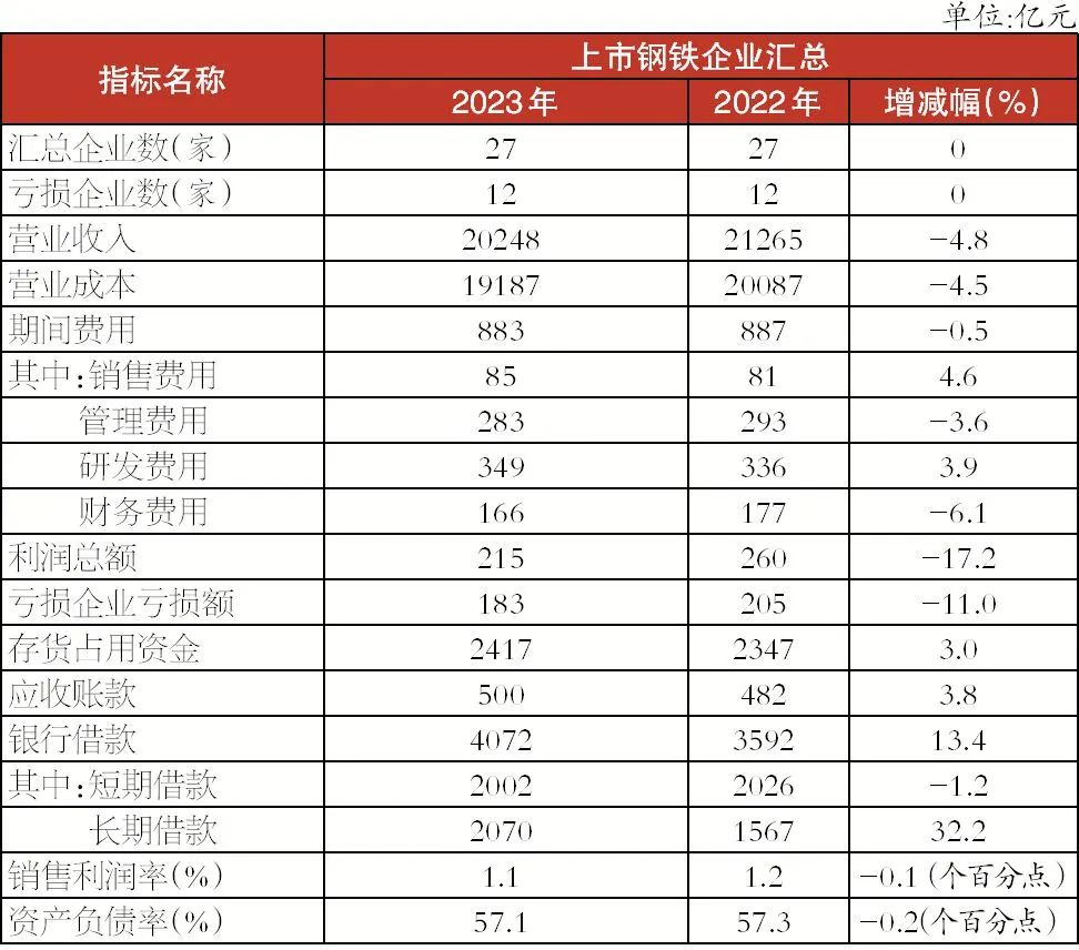 進(jìn)入2024年第1季度,鋼鐵行業(yè)運(yùn)行情況仍不樂觀,經(jīng)濟(jì)效益繼續(xù)下滑。27家上市鋼企合計(jì)營業(yè)收入4715億元,同比下降5.9%;合計(jì)營業(yè)成本4533億元,同比下降4.9%;合計(jì)期間費(fèi)用201億元,同比下降1.7%;合計(jì)實(shí)現(xiàn)利潤虧損1億元,同比由盈變虧;虧損額69億元,同比增長118.1%;虧損面48.2%;平均銷售利潤率-0.02%,同比下降1.02個(gè)百分點(diǎn)。截至第1季度末,存貨占用資金同比下降4.3%;應(yīng)收賬款同比增長8.4%;短期借款同比下降0.3%;長期借款同比增長8.9%;平均資產(chǎn)負(fù)債率57.3%,同比下降0.7個(gè)百分點(diǎn)。具體各指標(biāo)情況見下表: