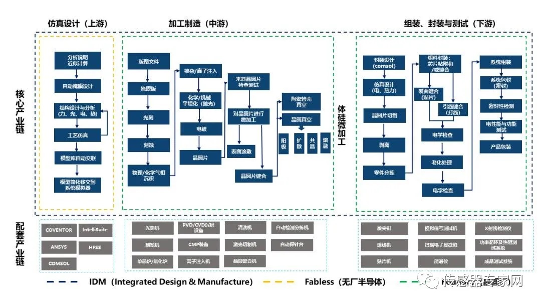 如下圖所示,智能傳感器產(chǎn)業(yè)鏈非常長,涉及數(shù)十個環(huán)節(jié),產(chǎn)業(yè)鏈的每個環(huán)節(jié)投入都較大,單一企業(yè)很難獨自承受產(chǎn)業(yè)鏈所有環(huán)節(jié)所需要的技術知識、人力成本及設備投入,且只有每個環(huán)節(jié)的產(chǎn)量足夠大,才能覆蓋其綜合成本,因而,智能傳感產(chǎn)業(yè)發(fā)展呈現(xiàn)出專業(yè)化、規(guī)模化和智能化的特點,即每個環(huán)節(jié)都可成為一家獨立的公司參與到產(chǎn)業(yè)鏈的生態(tài)發(fā)展,而生產(chǎn)制造環(huán)節(jié)是所有環(huán)節(jié)中投入最大的部分。