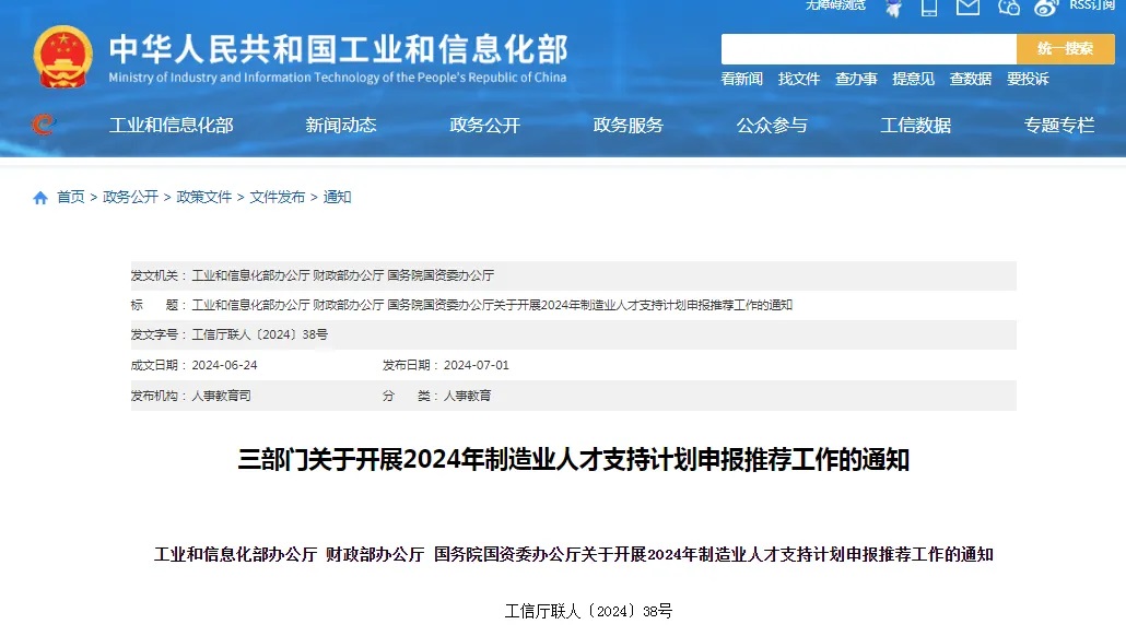 工業(yè)和信息化部辦公廳 財(cái)政部辦公廳 國務(wù)院國資委辦公廳關(guān)于開展2024年制造業(yè)人才支持計(jì)劃申報(bào)推薦工作的通知