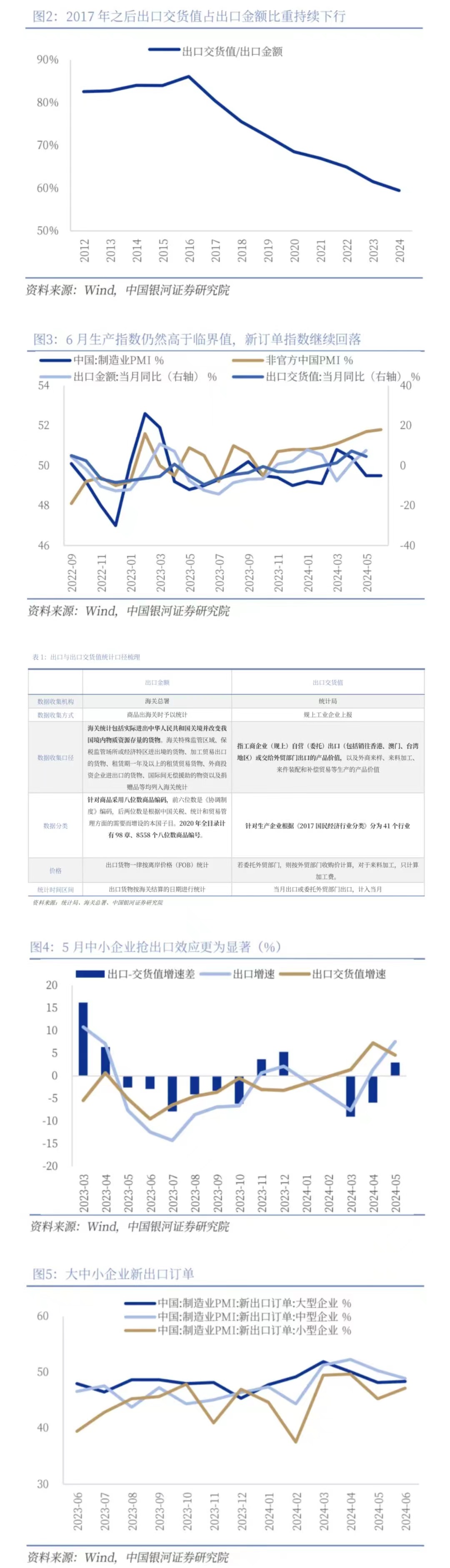 財新PMI更多反映外向型企業(yè)的景氣度,出口增速持續(xù)改善對應財新PMI的持續(xù)擴張。官方和財新PMI調查樣本存在差異:中采PMI的調查樣本涉及《國民經(jīng)濟行業(yè)分類》(GB/T4754-2017)中制造業(yè)的31個行業(yè)大類,3200家企業(yè),同時在選取樣本時會對增加值較高的行業(yè)賦以更高的權重,因此中采PMI抽樣的企業(yè)更多是在行中占比較高的大型企業(yè)。中采PMI更加綜合,而財新PMI更多反映外向型企業(yè)生產經(jīng)營情況。與之相比,財新制造業(yè)PMI統(tǒng)計樣本為650家企業(yè),普遍認為調查樣本主要以沿海地區(qū)出口導向型的中小型民營企業(yè)及輕工業(yè)為主。5月出口金額同比增長7.6%,出口交貨值同比增長4.6%,保持上行趨勢。從2023年11月以來,出口金額增速除了在2024年3月受去年基數(shù)影響有負增長,其余月份均保持正增長。當前外需整體好于內需,出口保持較高韌性,因此財新PMI持續(xù)高于中采PMI。