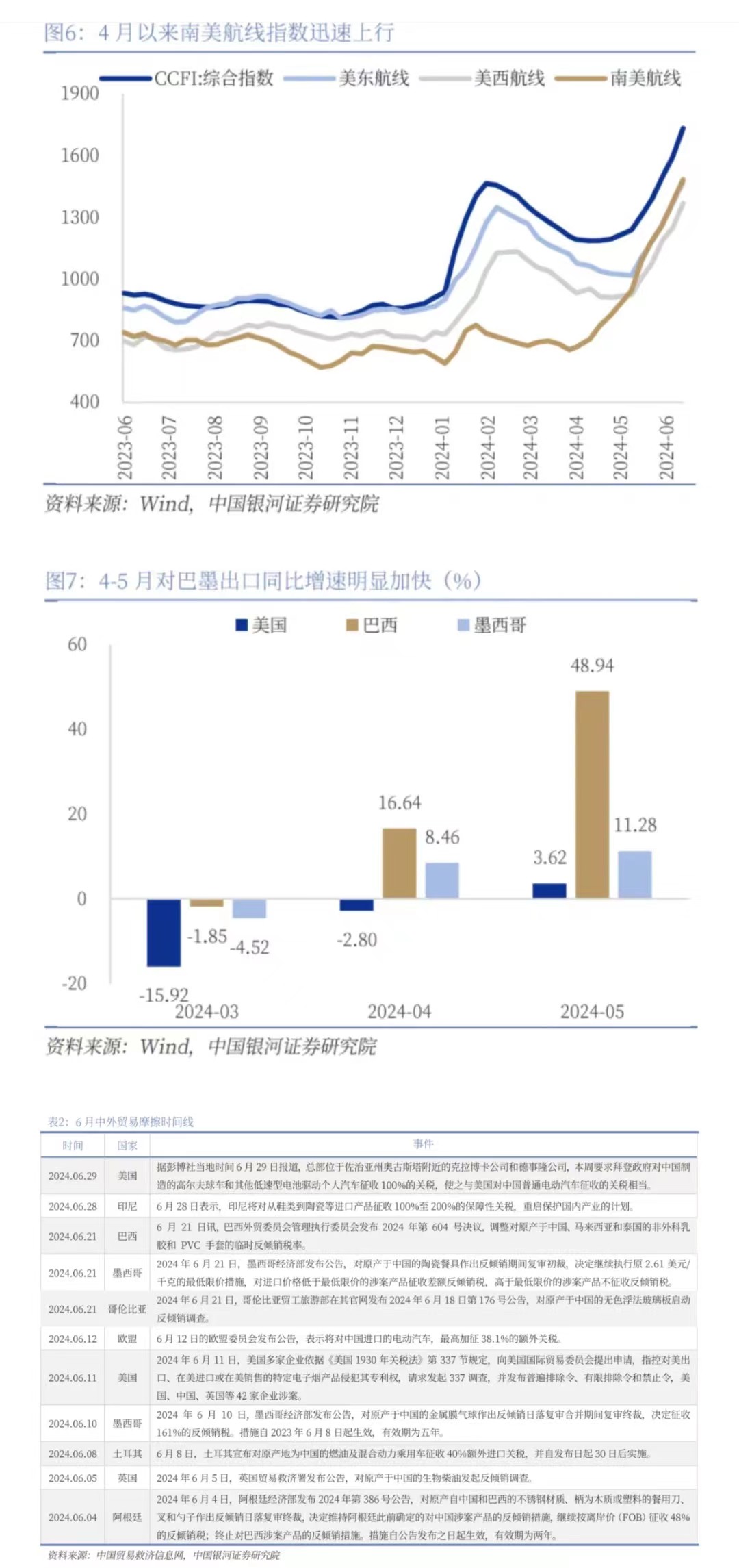 受制于進口國貿易政策的變化和地緣政治的潛在影響,企業(yè)出現(xiàn)搶出口行為。5月14日美方發(fā)布對華加征301關稅四年期復審結果,進一步提高對自華進口的電動汽車等約180億美元商品加征關稅。6月以來歐盟、土耳其、巴西、印尼等也陸續(xù)宣布將對我國部分出口商品加征關稅。受此因素驅動,企業(yè)出現(xiàn)“搶出口”行為以規(guī)避高額關稅,帶動5月出口增速同比上行至7.6%。從航線運價指數(shù)來看,5月份以來CCFI指數(shù)迅速上漲,美東和美西航線分別環(huán)比上漲23.5%和30.4%,南美航線上漲53.4%。從對美國、墨西哥、巴西三地的出口增速來看,5月份我國對其三者出口同比分別增長3.6%、11.3%和48.9%,對墨西哥尤其是巴西出口增速的高增長或指向部分商品借道巴墨等地以滿足對美出口需求。對外貿更加敏感的中小企業(yè)具有更顯著的搶出口效應,5月出口增速改善幅度顯著好于出口交貨值增速。