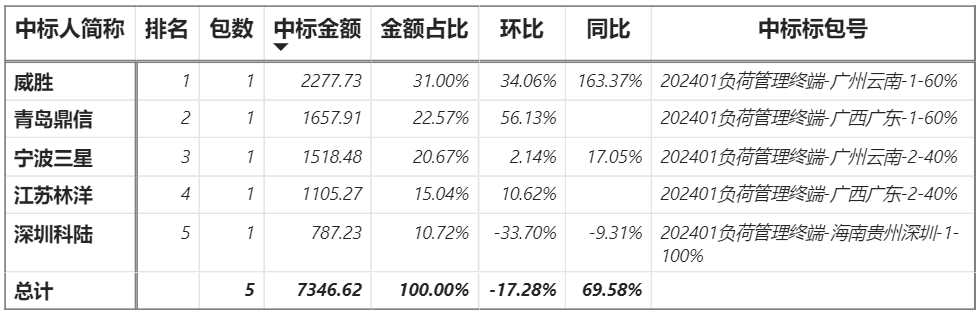 總金額7346.62萬元,5家企業實現中標,威勝中標最大包2277.73萬元;