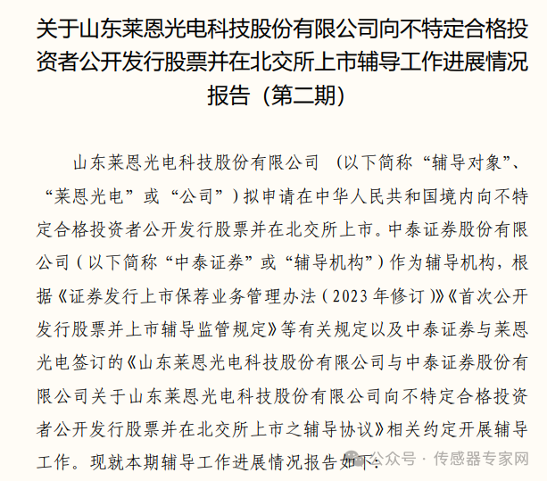 2023年12月,萊恩光電與中泰證券簽署上市輔導協議,截止2024年7月8日,已完成第二期輔導工作。