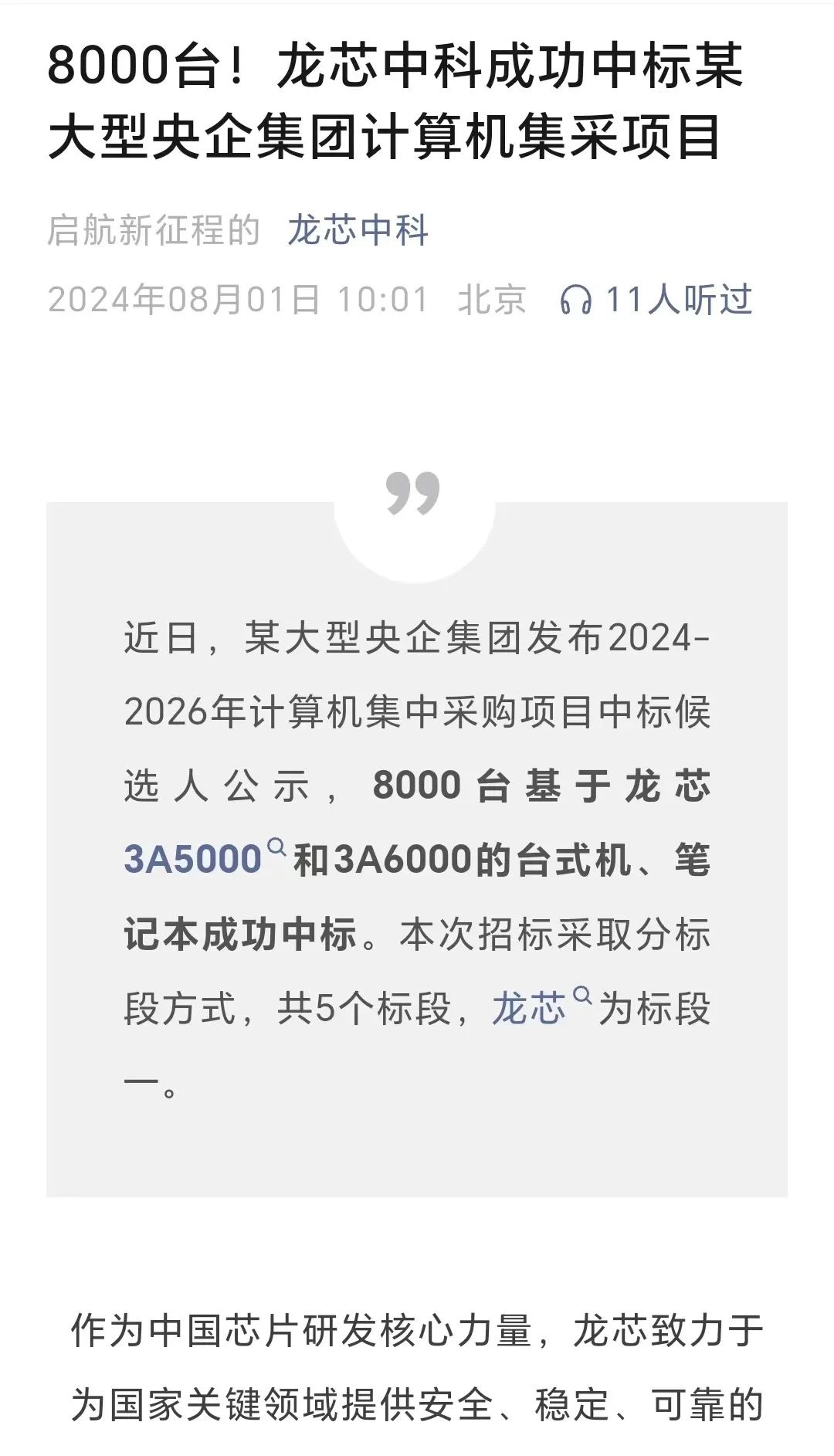 81日,龍芯中科在其官方微信公號中曾發文稱,近日,某大型央企集團發布2024-2026年計算機集中采購項目中標候選人公示,8000臺基于龍芯3A50003A6000的臺式機、筆記本成功中標。本次招標采取分標段方式,共5個標段,龍芯為標段一。