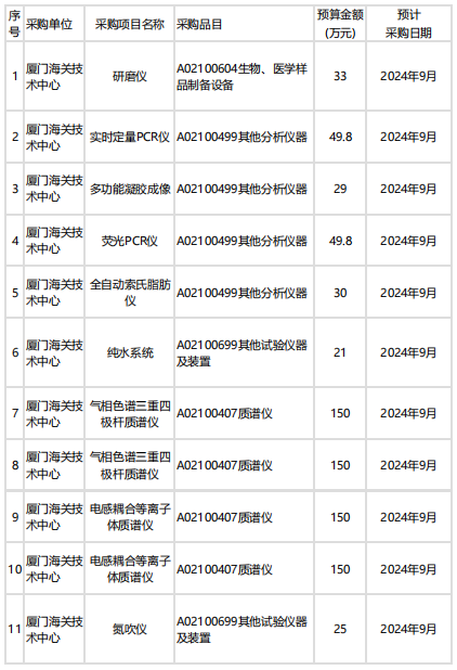 廈門(mén)海關(guān)技術(shù)中心本次共計(jì)預(yù)算2748萬(wàn),預(yù)采購(gòu)實(shí)時(shí)定量PCR儀、多功能凝膠成像系統(tǒng)、氣相色譜三重四級(jí)桿質(zhì)譜儀、電感耦合等離子體質(zhì)譜儀等。