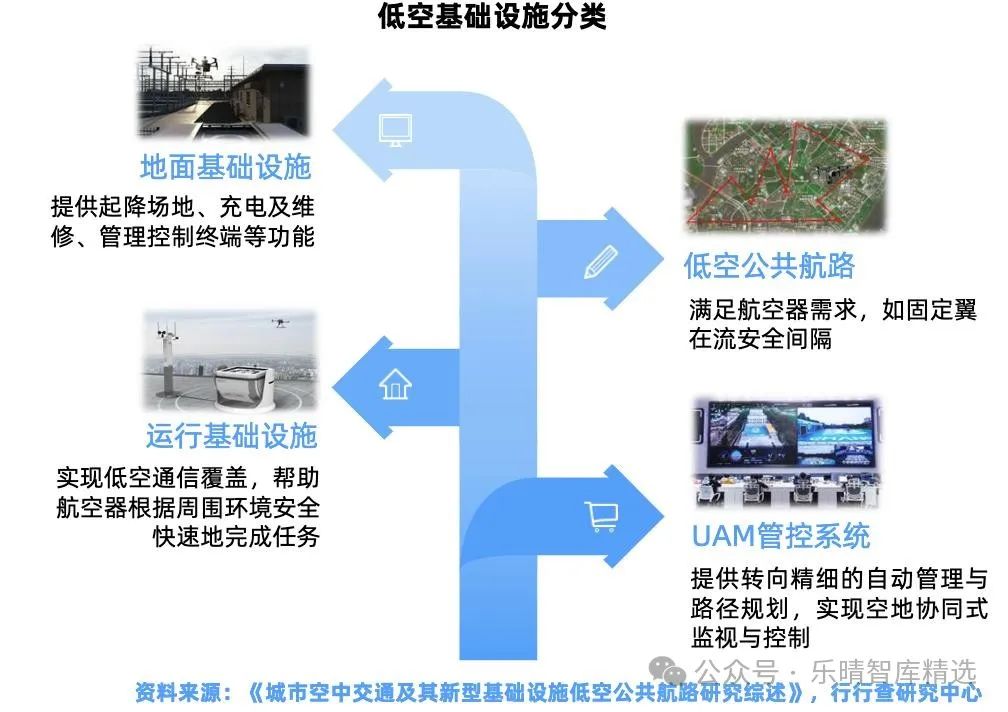 低空基礎設施主要由運行和地面兩大類設施構成,同時輔以公共航路和管控系統。