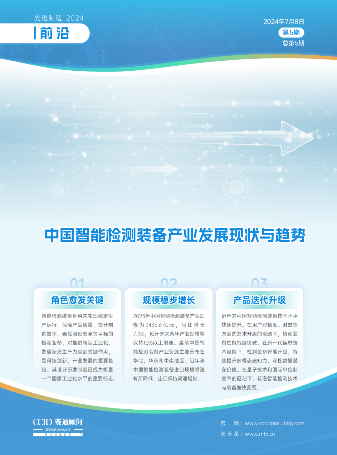 2023年中國智能檢測裝備產業規模為2436.6億元,較上年增長7.9%。受國家推進新型工業化、發展新質生產力、加快工業設備更新等利好政策影響,預計未來幾年將持續保持10%以上的增速,2025年整體產業規模將突破3000億元。隨著智能制造深入推進,智能檢測裝備需求日益增加,新技術新產品競相涌現,產業呈現快速發展勢頭。總體來看中國智能檢測裝備產業仍存在技術基礎薄弱、創新能力不強、高端供給不足、產業體系不完善和應用生態不健全等問題,已成為智能制造深入發展的關鍵短板和重要制約。黨的二十屆三中全會公報指出,高質量發展是全面建設社會主義現代化國家的首要任務。推進智能檢測裝備發展是產業基礎高級化的重要領域,對推進產業實現歷史性變革、系統性重塑、整體性重構具有重要價值。工信部等部門出臺的《智能檢測裝備產業發展行動計劃(2023-2025年)》等一系列政策,提出了“到2025年,智能檢測技術基本滿足用戶領域制造工藝需求,核心零部件、專用軟件和整機裝備供給能力顯著提升,重點領域智能檢測裝備示范帶動和規模應用成效明顯,產業生態初步形成“等發展目標。