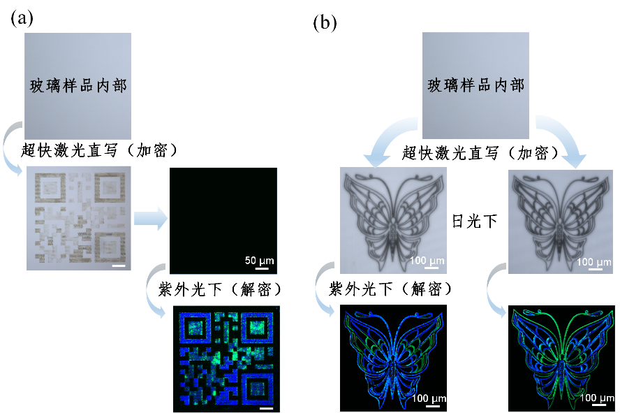 6 超快激光直寫用于信息加密的納米晶圖案。(a)直寫二維碼圖案,比例尺為50 um,激發光波長為405 nm;(b)圖案加密,圖案在日光下沒有顯著差異,在405 nm紫外光下則顯示出不同的綠色和藍色區域,比例尺為100 um
