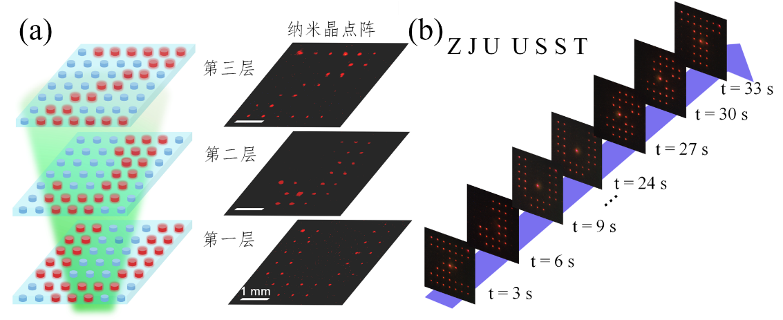 除二維的平面顯示外,該技術方案還能演示三維的全息顯示器件。將立體的圖案通過空間光調制器設計的全息圖在多個平面上分層顯示,可以同時激發點亮不同層的圖案。如圖 5a)所示,三幅全息圖像(字母ZJU)激發的熒光圖案在沿激發光輻照方向上的多個平面上同時被構建,在不同層顯示了對應的字母ZJU的紅色熒光圖案。預先設置好的全息圖案的播放時間和順序,在內部具有多個納米晶發光單元陣列的玻璃基板上還能實現動態的全息顯示,如圖5b)在不同時刻分別顯示了字母ZJUUSST的熒光圖案。
